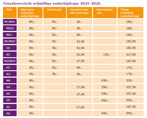 Totaaloverzicht vrijwillige ouderbijdrage 2025 - 2026